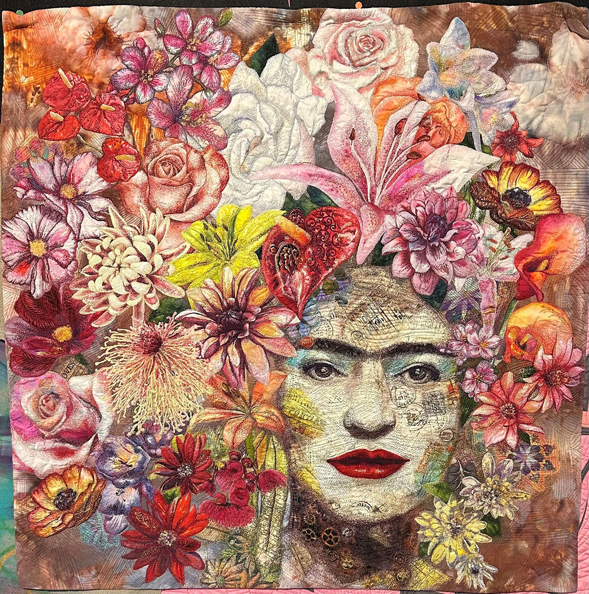 A textile portrait celebrating resilience and creative spirit. Inspired by Frida Kahlo, it layers floral fabric collage, raw-edge stitching, and expressive details to reflect how nature and strength intertwine. Flowers bloom not only around her but from within—mirroring how her love for her work blossoms through every struggle. This piece honours growth born of pain, and how creativity can both shelter and transform us when we let it bloom fully.