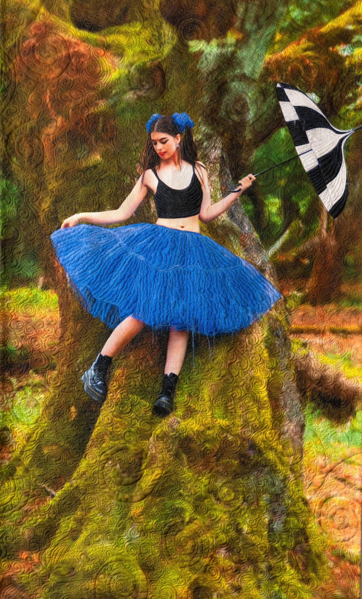 Start up with the striped umbrella. She reaches for her dream with determination and strength. With arms open wide, she gathers the energy of joy—ready to rise and meet the day. My work—whether in quilting or photography—is rooted in that same energy. I move through the creative process with curiosity and trust, guided by feeling more than formula. There are moments when I take a photo and I know—that was it. The moment when the spirit revealed itself. It isn’t about the perfect camera, lens, or edit. It’s about presence. It’s about trust and vulnerability in connection. That is where the moment lives. With quilts, too, it’s not only about the fabric or thread. It’s about rhythm, memory, and intention. Each stitch becomes a meditation. A story told through texture. I often feel like I’m balancing an invisible umbrella—just like life with playfulness and the fearless grace of youth. Both mediums allow me to explore what it means to be fully alive: to notice, to feel, to respond. My hope is that others feel this energy in my work, something honest, something open, something that invites them into their own moment of joy or reflection.