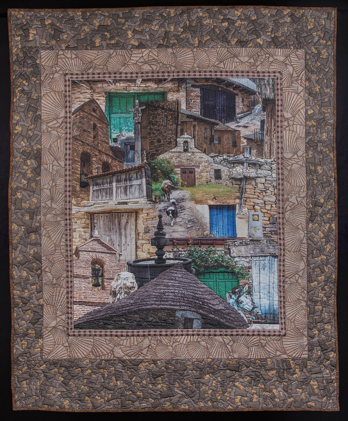 Portals on my Camino: I hiked 260 miles of the Camino Frances in Northern Spain and documented the landscape and villages photographically. From these I produced montages on the theme of pilgrimage. This composition combines multiple doors and portals to my experience along the way. The outer border design is a pattern I generated from three horreos, (storage structures for corn, grain or dried fish). The inner border is from a street tile of a shell. The shell is a symbol for pilgrims.