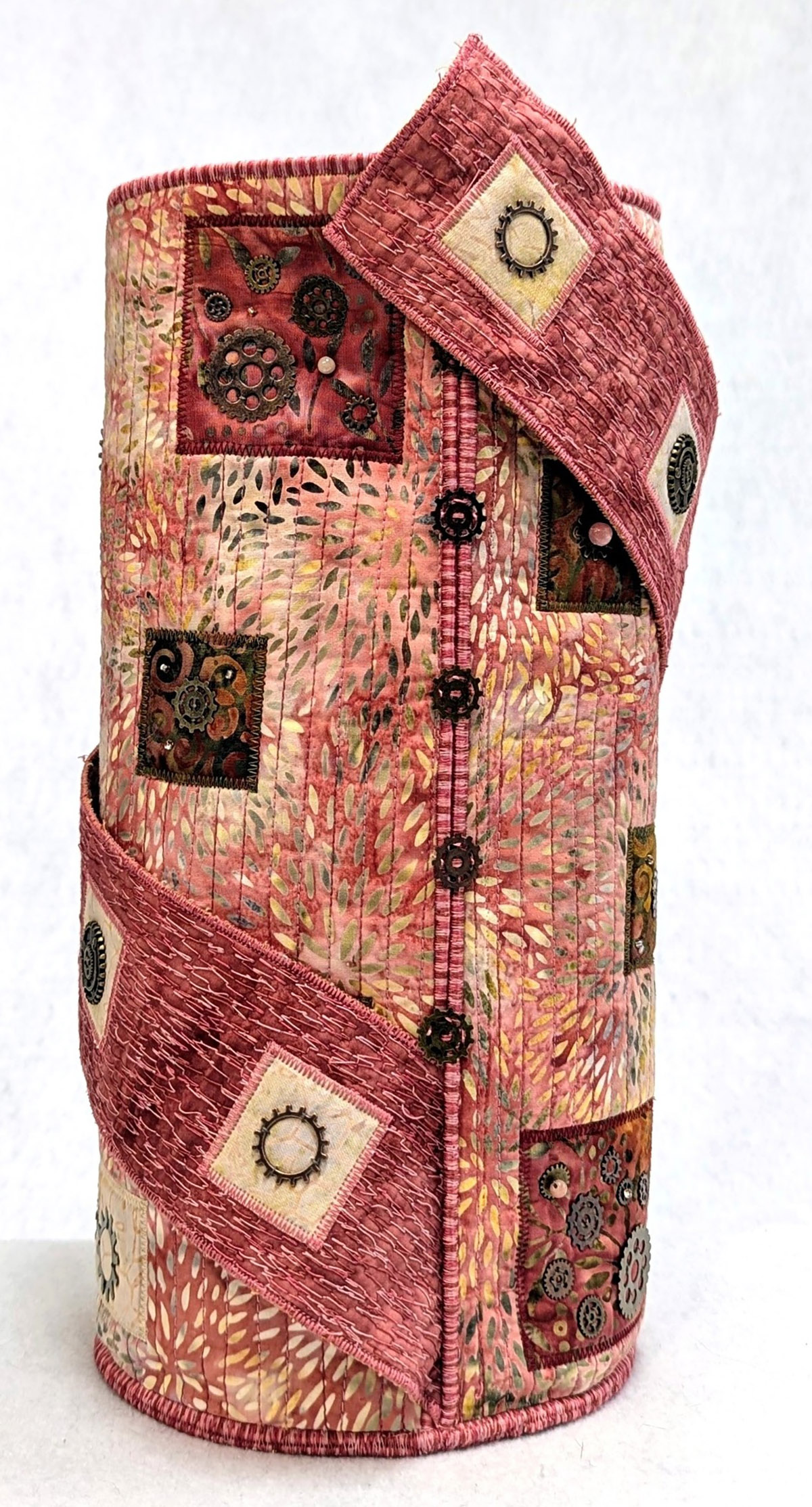 Keweenaw Gear Works is a tribute to the Keweenaw Peninsula, located in Michigan’s Upper Peninsula. The outer strip is a nod to Agate Beach, which really is that rust red color. Other colors on the vessel represent copper, the early source of the Upper Peninsula’s wealth. Gears represent the mines and industry that attracted immigrants to the area. Tourism is now the main source of income in the Keweenaw, but remnants of its past are still visible today.