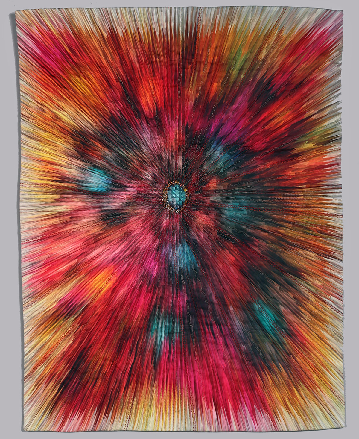 The artist creates abstract and figurative fabric works that explore the intersection of the digital and the handmade. Blending traditional fiber techniques with contemporary tools such as Photoshop and digital printing, the work bridges past and present. These ideas come into focus in Noon, inspired by the natural world. The sun appears like a jewel in the sky, radiating outward in waves of bright light. Beading and metallic threads enhance this vivid digital print, derived from an original painting.