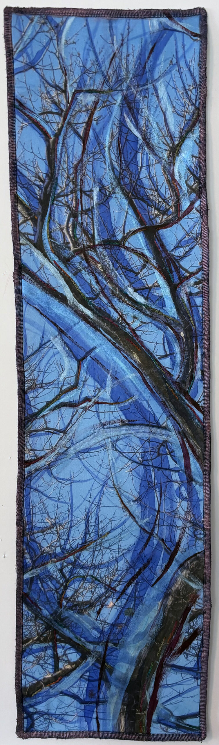 Flow is a piece about the meditative quality of nature and the creative process. It started with a photo of a tree printed on fabric that I then painted on and hand-stitched to follow the flow of the tree branch patterns and the movement of air around the branches.